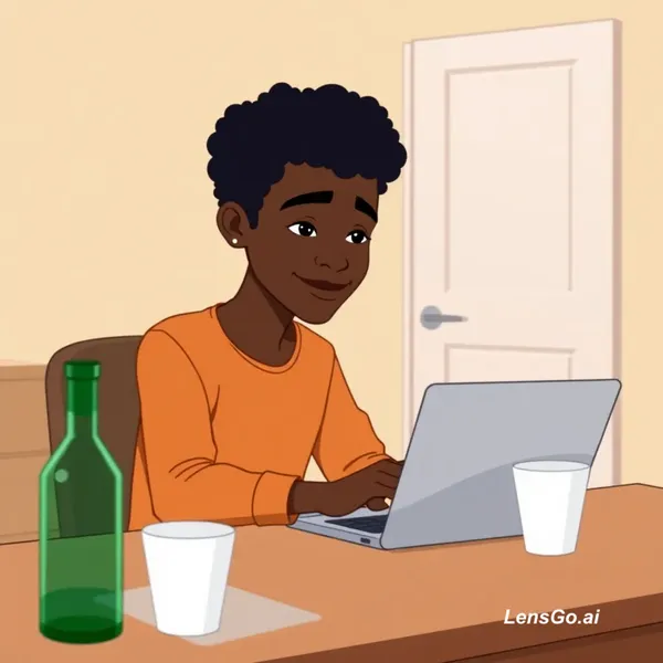 A stylized 2D animated scene of a young man with dark skin and short curly hair sitting at a wooden desk in a simple room. He is typing on a laptop with a relaxed smile, slightly leaning forward. On the desk, there is a green bottle and a white cup. The background has minimal beige walls and a closed door. Soft indoor lighting, clean cartoon style similar to modern animated series. Subtle hand and facial movements while typing, calm and focused mood, smooth animation, medium shot, static camera.
