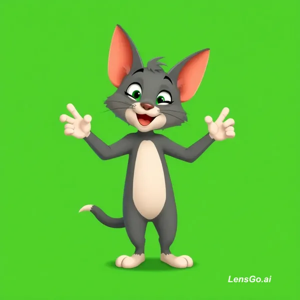 A full-body cartoon cat character inspired by Tom, with big ears, standing upright like a human. The character is centered on a solid green background (green screen). Bright, classic cartoon style, smooth animation, expressive face. Exact animation timing (6 seconds total): 0.0–1.0 sec: Idle standing, blinking 1.0–2.0 sec: Raises right hand up once, then lowers it down 2.0–3.0 sec: Raises left hand up once, then lowers it down 3.0–4.0 sec: Small pause + anticipation (slight crouch) 4.0–4.8 sec: Jumps up with energy (ears bounce) 4.8–6.0 sec: Starts funny dancing (arm swings, foot tapping, head bobbing) Style: 2D cartoon, squash and stretch, playful, exaggerated motion Camera: static, full-body centered Background: solid green screen Quality: 4K UHD (3840×2160), 24fps, smooth animation Duration: 6 seconds