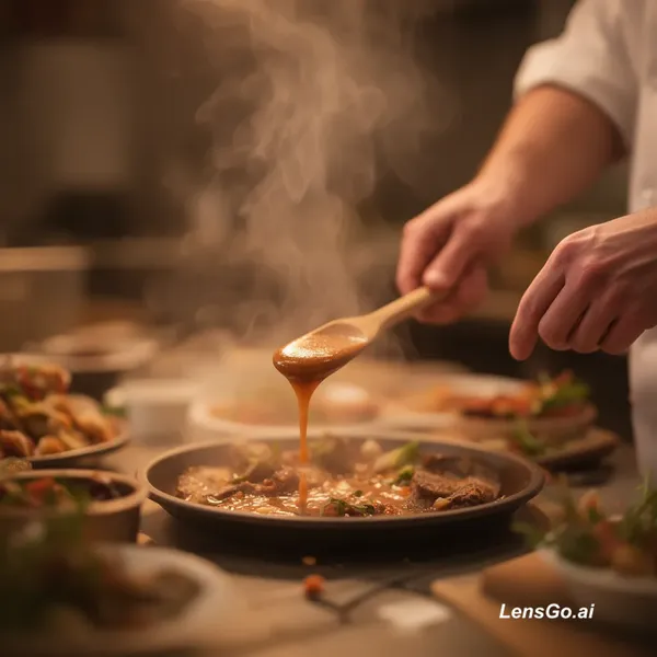 Cinematic close-up of food preparation, steam rising, chef's hands in motion, shallow depth of field, warm lighting, slow-motion pour of sauce, commercial food film quality