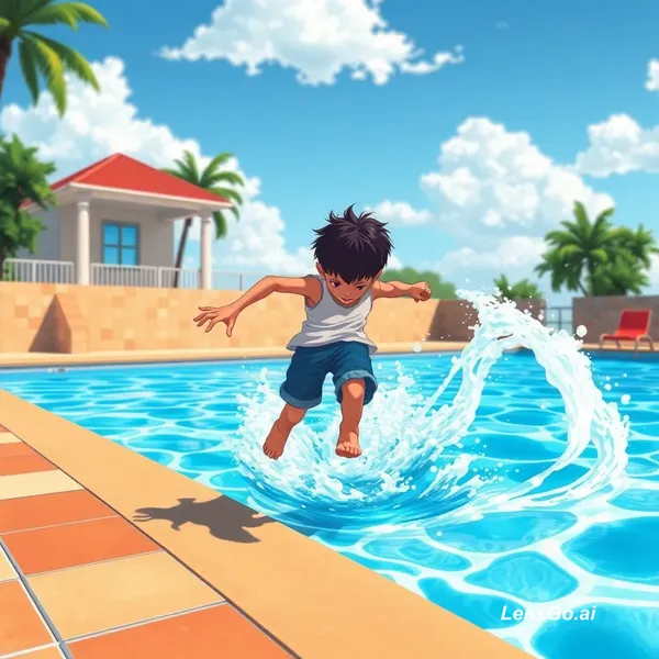 AI Image: Anime style boy running toward a swimming pool, sunny day, he jumps into the water with a big splash