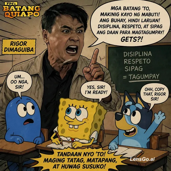 AI Image: Rigor dimaguiba teachs to Bloo, SpongeBob and Bluey in comic style scene