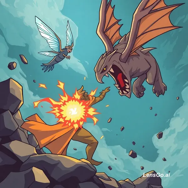 AI Image: He flies and then a monster which is very big punches him