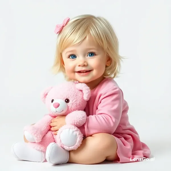 AI Image: Full body view Cute little girl smiling sitting on the floor, holding a pink teddy bear. She has pla