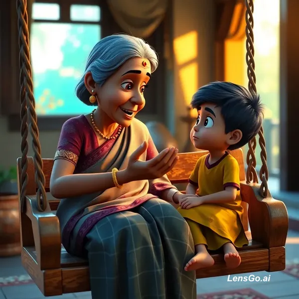 AI Image: "An emotional 3D animation of an Indian grandmother sitting on a wooden swing (jhoola) with her litt