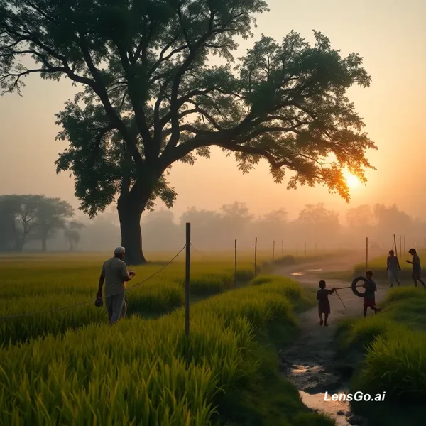 Cinematic 4K video of a peaceful sunrise in a green village. A farmer walking through golden wheat fields, an old man sipping tea under a large banyan tree, and children playing with a wooden tyre on a dusty path. Soft morning mist, birds chirping, and the sound of a flowing stream. High quality, slow motion, nostalgic atmosphere."