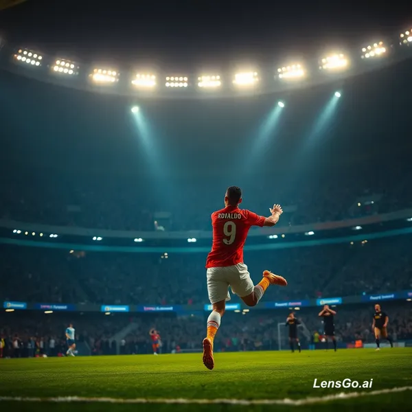 “Cristiano Ronaldo taking a perfect free kick, ball flying into the top corner of the goal, dramatic stadium lights, crowd celebrating, slow motion, cinematic football scene.”14