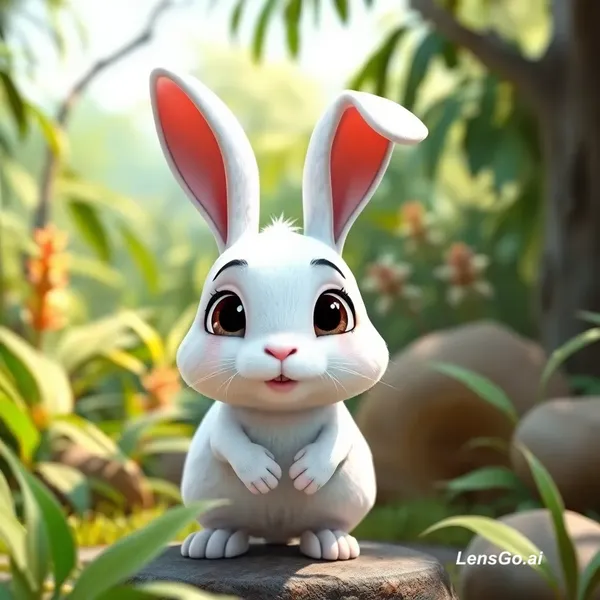 AI Image: cute white rabbit cartoon, pixar style, jungle background, 3D cartoon, ultra HD