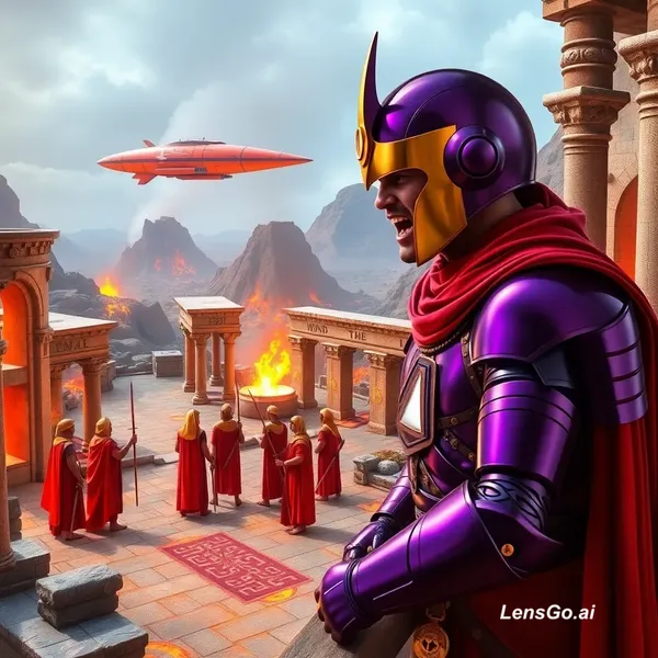 have a man in futuristic purple shiny and polished armor and helmet with bronze visor with a white triangle on his chest be shouting and yelling orders from a balcony at egyptian men in red and orange robes, gold jewelry and gold headdress in line formation holding long swords in the courtyard below. have the courtyard surrounded by lava with volcanoes erupting nearby. have a red and orange futuristic spaceship landing nearby on a landing pad.