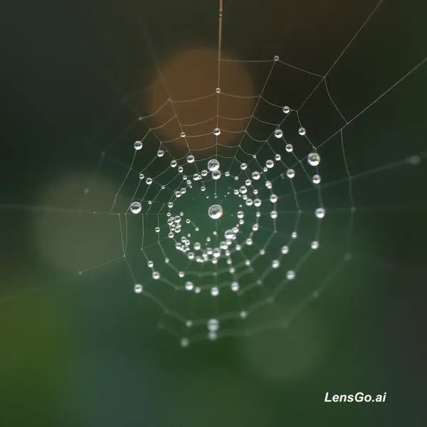 AI Image: Macro photograph of morning dew on spider web, bokeh background