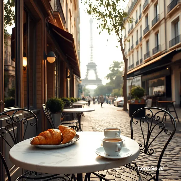 A charming Parisian sidewalk cafe in Montmartre, wrought-iron chairs, fresh croissants and espresso on a marble table, cobblestone street, the Eiffel Tower visible in the background through morning haze, warm golden light, vintage film look