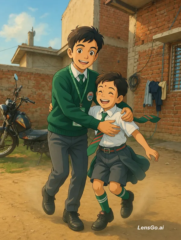Two young school boys standing together in a small village courtyard, in soft Studio Ghibli style. The older brother gently keeps his arm around the younger one. Both brothers slowly start smiling warmly. Then they begin to spin around playfully while holding each other, expressing love and happiness. Their school uniforms move slightly with the motion. Soft morning sunlight, warm tones, gentle breeze, subtle camera movement, cinematic, highly detailed, emotional and wholesome atmosphere, smooth animation, 4K quality.
