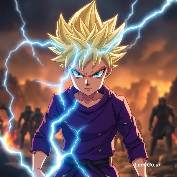 AI Image: young anime boy, spiky golden hair, electric blue lightning aura, angry expression, torn purple outf