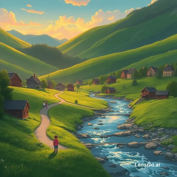 AI Image: Studio Ghibli style peaceful village, green hills, river flowing, children playing, warm sunset ligh