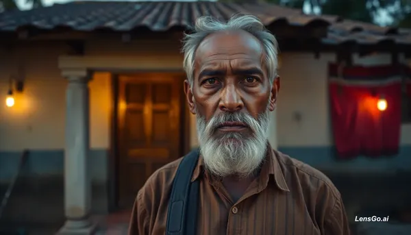AI Image: Old strict Indian landlord standing in front of small house, serious face, evening light, small town