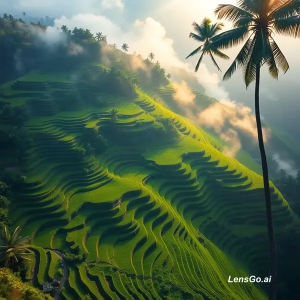 Aerial view of the Tegallalang rice terraces in Bali, Indonesia, lush emerald green paddies carved into the hillside, soft morning mist rising, golden light filtering through tropical palms, serene natural landscape. Hi