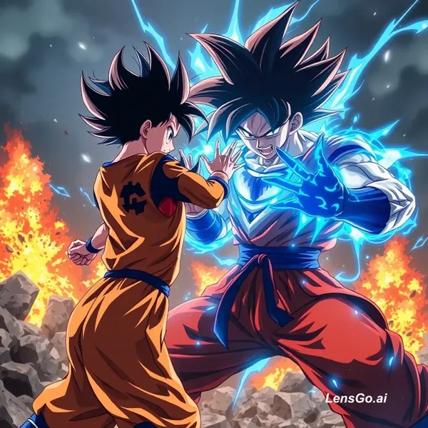 Uma criança corajosa lutando contra um poderoso guerreiro estilo anime parecido com Goku, cabelo espetado e aura de energia azul. Cena de batalha épica, explosões de energia, movimentos rápidos, cenário destruído, estilo anime japonês, iluminação dramática, muito dinâmico, qualidade cinematográfica.