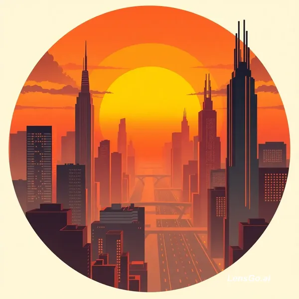 AI Image: Art deco poster of a futuristic city skyline at sunset