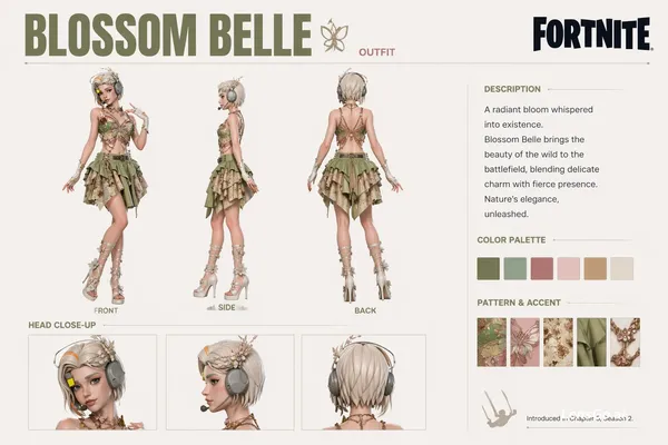 A clean and minimalist infographic featuring a Fortnite character skin, showcasing the outfit in front, side, and back views, accompanied by zoomed-in portraits of the head from the same three angles below. The design incorporates a refined color palette, highlighting variations of the outfit's patterns and hues. At the top, the skin's name is displayed in a large, modern typeface, positioned beside the official Fortnite logo to create a polished, collaborative aesthetic. Include a dedicated section for a concise textual description of the skin, all arranged with a spacious, balanced layout on a solid, neutral background.