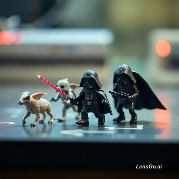 AI Image: Miniature Star Wars inspired creatures walking across a tabletop, tiny detailed figurines with soft