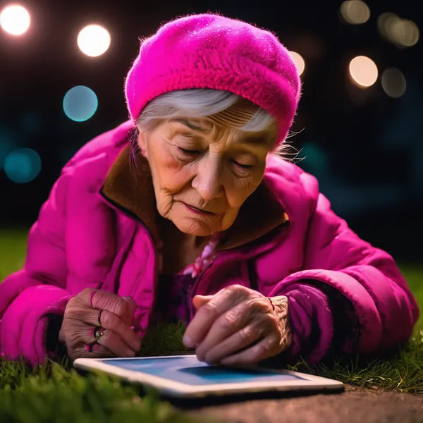 Candid smartphone photo, isometric angle view of an elderly wrinkled grandmother lying on grass at night, wearing a bright pink fishing hat and pink jacket, forehead tattoo reading 'solo IA lokz', exhausted and emotionally resigned expression with blank stare, close-up zoom focused on her weathered face, illuminated by warm nocturnal artificial lights creating ambient glow, natural organic color grading with minimal saturation, realistic skin texture with age spots and deep wrinkles, atmospheric