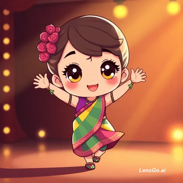 AI Image: “Cute chibi girl with big sparkling eyes dancing Bollywood style in a colorful saree, joyful express