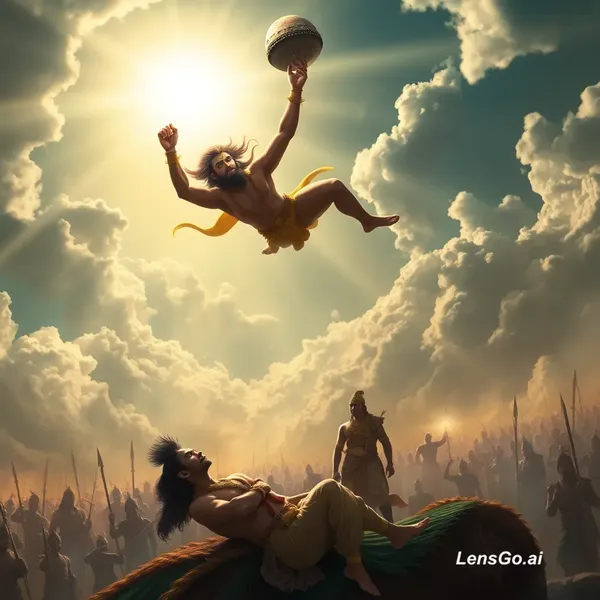 Hanuman flying high in the sky, carrying an entire mountain in one hand, with a determined and devoted expression on his face. Below, on the battlefield, Lakshmana is lying unconscious while Rama stands beside him looking worried. The Vanara army surrounds them, and the scene shows an intense war atmosphere. The sky glows with divine light, highlighting Hanuman’s strength and devotion. Epic, cinematic, highly detailed, vibrant colors, dramatic lighting, mythological Indian art style.
