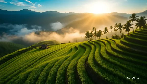 AI Image: Tegallalang rice terraces at sunrise with morning mist rolling through, lush green paddy fields, tra