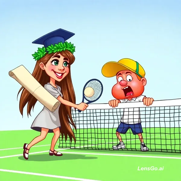 AI Image: A humorous 2D comic caricature illustration of a newly graduated girl playing tennis against Jannik