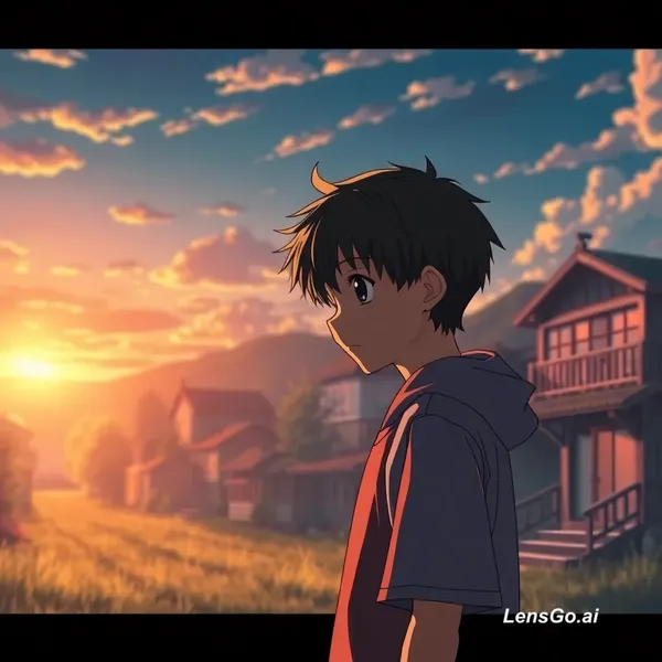 “anime boy standing in a peaceful village, sunset lighting, soft glow, cinematic, highly detailed, emotional atmosphere”