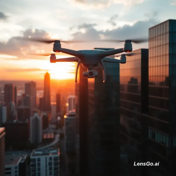 AI Image: Smooth aerial drone shot flying over a modern cityscape at sunset, reflections on glass buildings, c