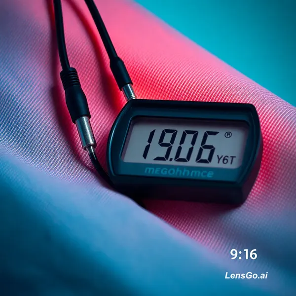 AI Image: Close-up vertical 9:16, megohmmeter connected to insulating fabric showing very high resistance read