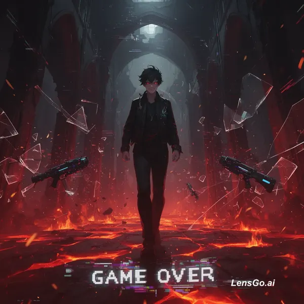 Cinematic dark cyberpunk anime style. A legendary 'Final Boss' character walking calmly through a crumbling digital cathedral. Molten lava and fire beneath the floating floor. Low angle shot, high contrast lighting in crimson and black. Digital weapons disintegrating into particles upon proximity. Glitch effects, slow-motion glass shattering, and embers. The character looks directly into the camera with a confident, menacing smirk. Intense glowing eyes. 4K, hyper-detailed, epic scale, 'Game Over' glitch ending.