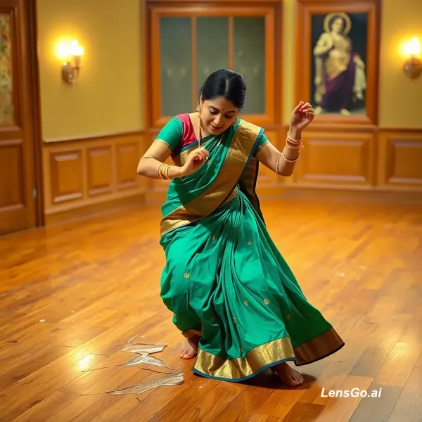 AI Image: An Indian girl dancing on a classical tune on the wooden floor and suddenly it broke and she fell in