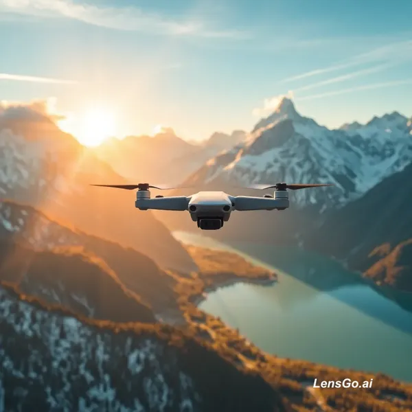AI Image: Cinematic drone shot flying over the Swiss Alps, snow-capped mountain peaks, a pristine alpine lake