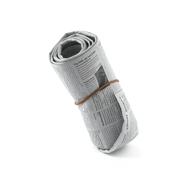 A full oversized rolled up newspaper used as a walking cane, thick cylinder shape, black and white newspaper print visible on the outside, slightly crumpled edges, rubber band around the middle holding it together, flat white background, entire object visible top to bottom, no shadows, product reference sheet style, 3D model ready