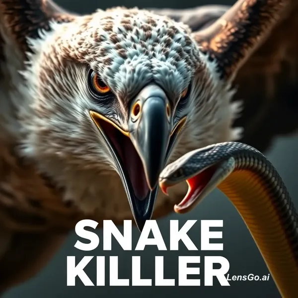 A cinematic YouTube thumbnail of an eagle attacking a cobra, intense close-up, sharp eagle eyes, cobra ready to strike, dramatic lighting, high contrast, motion blur wings, 1280x720, bold text "SNAKE KILLER"