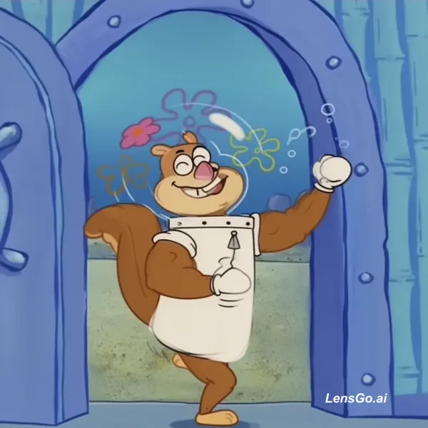 AI Image: A cheerful cartoon squirrel character dancing happily, simple looping dance motion, rhythmic arm and