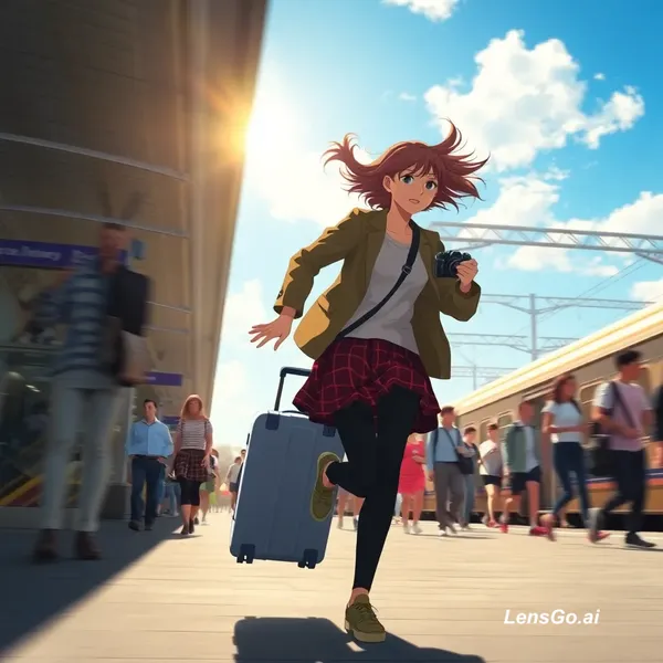 anime cinematic, busy train station morning, bright blue sky, many people walking calmly, suddenly a young woman running in panic with suitcase and camera, motion blur, dynamic movement, hair flowing, energetic chaotic mood, Makoto Shinkai style, highly detailed, 9:16