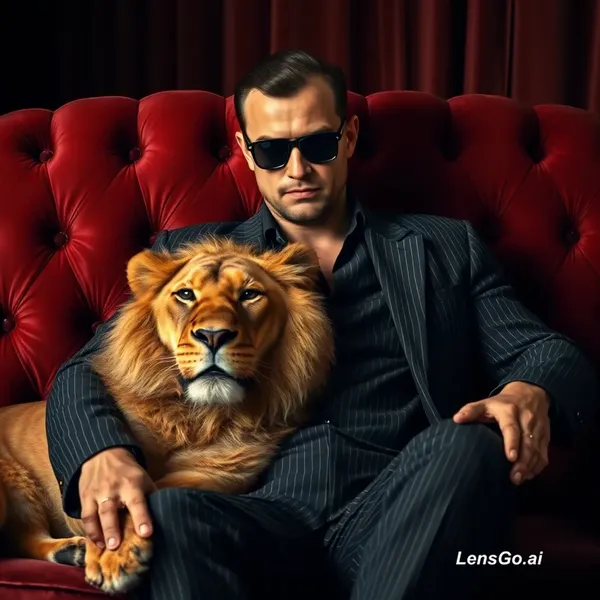 A hyper-realistic cinematic portrait featuring my uploaded face, styled as a powerful gangster. Sitting confidently on a luxurious velvet sofa, head slightly tilted downward, wearing dark sunglasses for an elegant aura. A lion rests naturally on my lap, with one hand placed calmly on its back and the other on the sofa’s armrest. Outfit: finely pinstriped suit or open-neck silk shirt, radiating quiet authority and non-aggressive power. Extreme detail, realistic textures, cinematic lighting, luxurious atmosphere.
