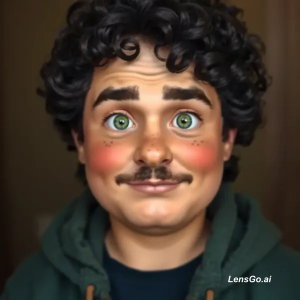 AI Image: this boy is middle aged. he is tall and fat. He has got long curly dark hair. He has got a round tan