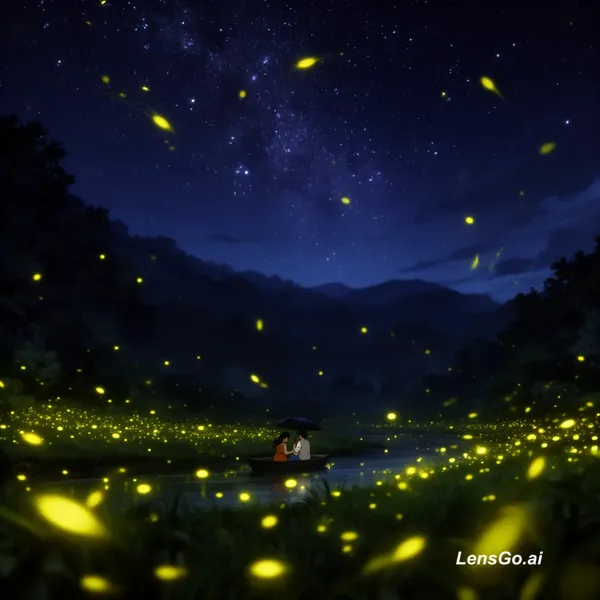 AI Image: night sky moving, fireflies glowing, cinematic anima