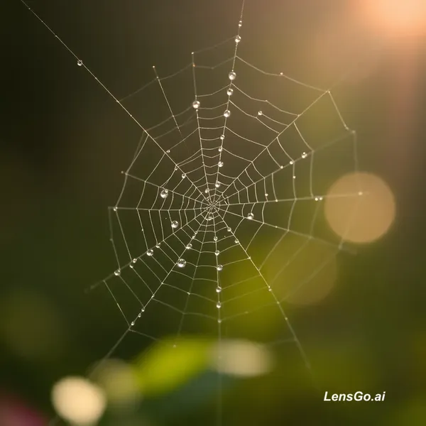 AI Image: Macro photograph of morning dew on spider web, bokeh background