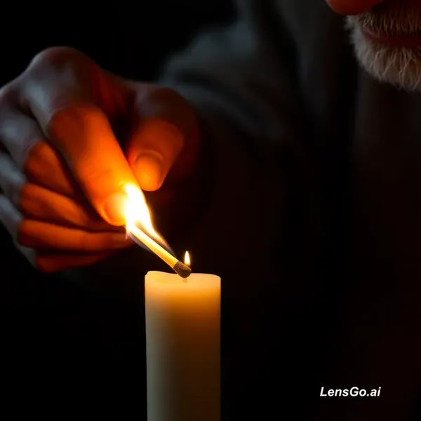 Close-up of the old hands. The match flares to life with a satisfying spark. Grandpa Tun moves the match to the candle wick, and a soft, warm flame begins to dance, casting a gentle, expanding circle of light. The darkness melts away slightly