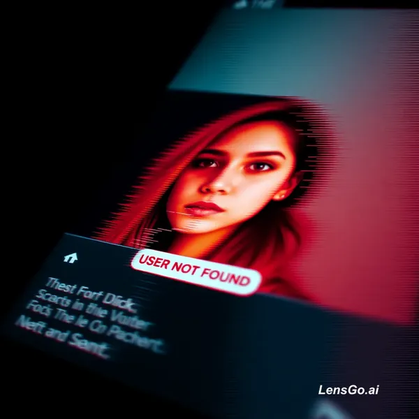 Close up on a smartphone screen in a dark environment. A girl's profile picture is visible but starts to glitch with digital artifacts. The face pixelates, turns into noise, and disappears. Eerie notification pops up: "USER NOT FOUND". Cinematic glitch effect