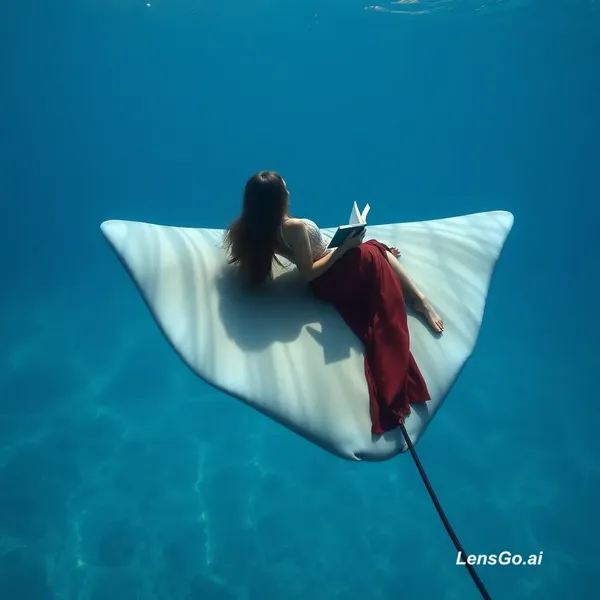 Generate a new image with the female person from the sent picture and place her on a passing floating manta ray in an underwater world kid of fiction kind of realistic. She is lying on the back of the manta ray on her back and is reading a book, very relaxed. Her outfit can vary but she should stay true to the person on the picture. The new generated image is giving tumblr aesthetic or photoshopped fiction art pic. Dreamy, deep and so on