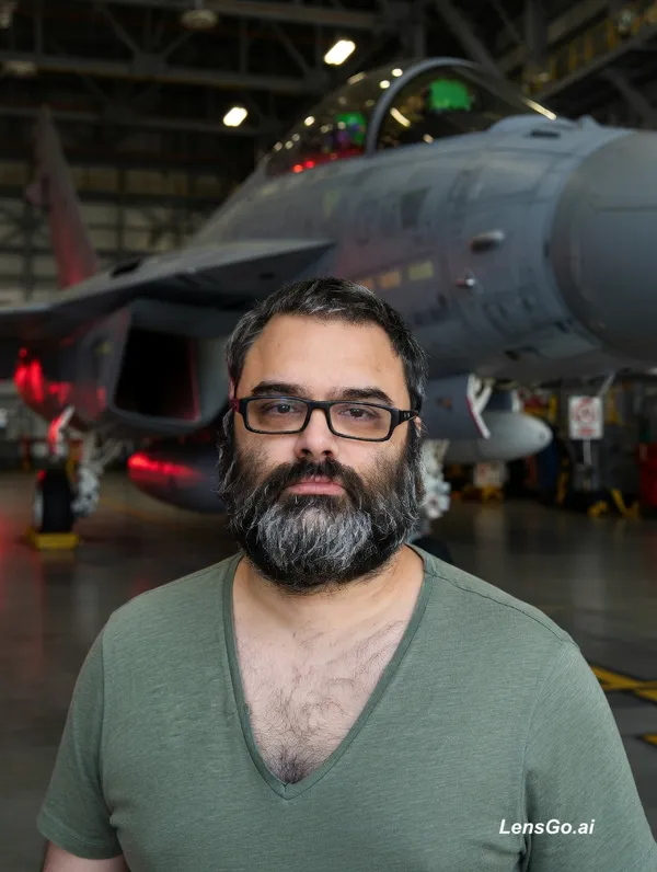 (Photorealistic portrait of the person in the reference image:1.5), (exact facial features:1.5), (original body shape and clothing:1.5), standing inside a massive military hangar, background with a detailed fighter jet, cinematic industrial lighting, red and white ambient lights, sharp focus, 8k resolution, shot on 35mm lens --no deformation, --no change of face