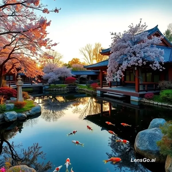 AI Image: A serene Japanese garden at golden hour, koi pond reflecting cherry blossoms