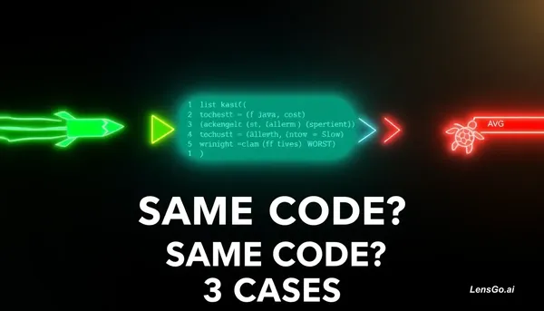 Create a highly engaging YouTube thumbnail (16:9) for a Data Structures & Algorithms video. Main concept: ONE Java code block behaving in THREE completely different ways. Scene: Center: A glowing Java code snippet (clean, minimal, readable style) From the same code, three arrows split outward: Left side (green): Fast rocket trail, smooth path, label "BEST" 🚀 Middle (yellow): Normal straight path, balanced motion, label "AVG" 😐 Right side (red): Broken, slow, zig-zag path with turtle icon, label "WORST" 🐢⚠️ Visual effect: The code is "splitting" into 3 different outcomes (like branching paths or decision tree) Background: Dark futuristic coding environment, subtle code texture, neon glow, depth and lighting Main text (BIG, bold, high contrast, minimal words): "SAME CODE?" Secondary small text (optional): "3 CASES" Style: Modern, clean, high contrast, YouTube thumbnail style, slightly 3D icons, glowing edges Color theme: Green (fast), Yellow (medium), Red (slow) on dark background Focus: Clear storytelling, minimal clutter, strong contrast, easy to understand even on mobile Ultra sharp, professional, high detail