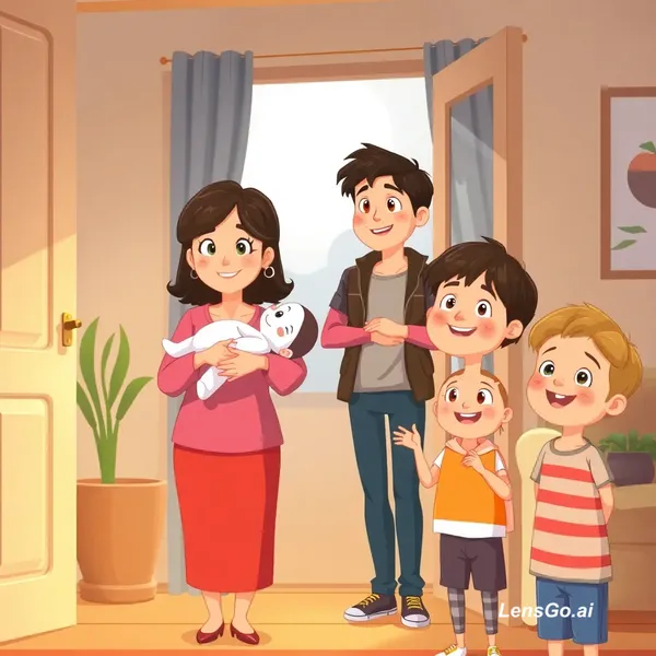 Digital cartoon / animated style illustration, vertical 9:16, cinematic lighting. Scene: happy family at home. Mother: holding a baby (a few months old) in her arms, smiling gently, looking lovingly at the baby. Father: leaving for work, dressed in casual clothes, waving or smiling at family. Children: two kids around 9–12 years old, standing nearby, smiling, looking at parents or sibling, excited and cheerful. Faces: round, natural cartoon features (not anime), small noses, thin lips showing ha