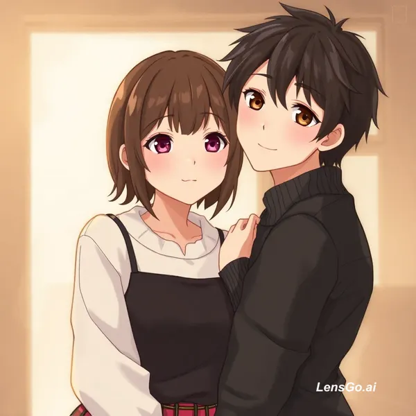 Transform this photo into a soft anime-style illustration with painterly textures and warm lighting. Keep the clothing, pose, and background accurate. Give the faces natural expressions with gentle eyes and subtle emotions, but avoid realistic facial details or exact resemblance to real people. Make the characters look like generic anime individuals while preserving the mood and memory of the scene."